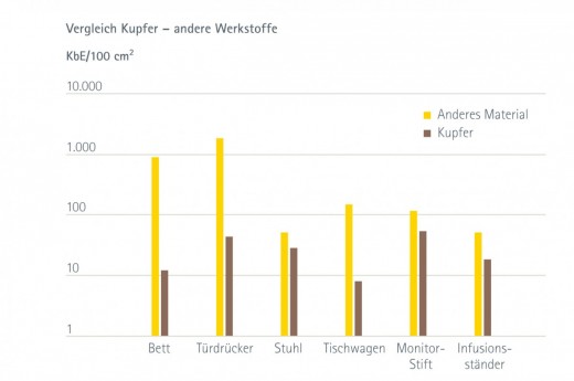 Im Rahmen einer Multicenterstudie wurde auf der 17 Betten umfassenden Intensivstation der Medical University of South Carolina, USA, eine Begleitstudie mit Sonderauswertung durchgeführt. Verglichen werden sollte die Wiederbesiedelung durch Keime auf Bettgriffen nach erfolgter Reinigung. Im Vergleich zum Mittelwert der Keimbelastung auf Kunststoff-Bettgriffen, der vor der Reinigung ermittelt wurde, lag dieser bei Kupfer-Griffen signifikant niedriger (6.102 KbE/100 cm2 oder 3,79 log10/100 cm2 vs 698 KbE/100 cm2 oder 2,84 log10/ 100 cm2). Nach Reinigung der Bettgitter kam es zu einem sofortigen Rückgang der Keimbelastung unabhängig vom Material. Die mittlere Reduktion betrug 82 % auf Kunststoff-Griffen (1.112 KbE / 100 cm2 oder 3,05 log10 / 100 cm2) und 48 % auf Kupfer-Griffen (362 KbE / 100 cm2 oder 2,56 log10 / 100 cm2). Es konnte festgestellt werden, dass die mittlere Keimbelastung auf Kupfer-Griffen nach der Reinigung auf einem deutlich niedrigeren Niveau blieb als auf den Kunststoff-Griffen. Die höchste anfängliche Keimbelastung betrug bei Kunststoff-Griffen 32.400 KbE/100 cm2 (4,51 log10 / 100 cm2). Bei Kupfer-Griffen, lag die höchste anfäng liche Keimbelastung bei 5.310 KbE / 100 cm2 (2,56 log10/100 cm²). Zusammenfassend wurde festgestellt, dass der zwischen den Griff-Materialien festgestellte Unterschied signifikant (P p .0001) ist. Mit Blick auf den empfohlenen Richtwert nach Reinigung blieben insgesamt 77 % der Kupfer-Griffe unter diesem Niveau, während nur 45 % der Kunststoff-Griffe unterhalb dieser kritischen Schwelle lagen. Die Studie wurde von Klinikern für Infektionskrankheiten unter der Leitung von Dr. Michael Schmidt, Professor und stellvertretender Vorsitzender der Abteilung für Mikrobiologie und Immunologie am MUSC, in drei Phasen durchgeführt.